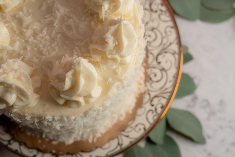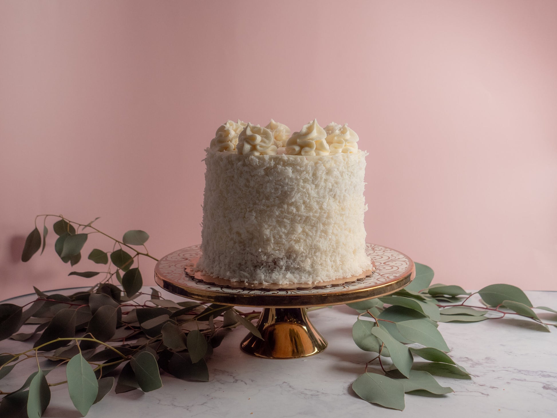 Coconut cake; filled with coconut cream cheese filling; iced with coconut cream cheese icing; finished with your choice of flaked or toasted coconut covered sides; topped with toasted coconut.