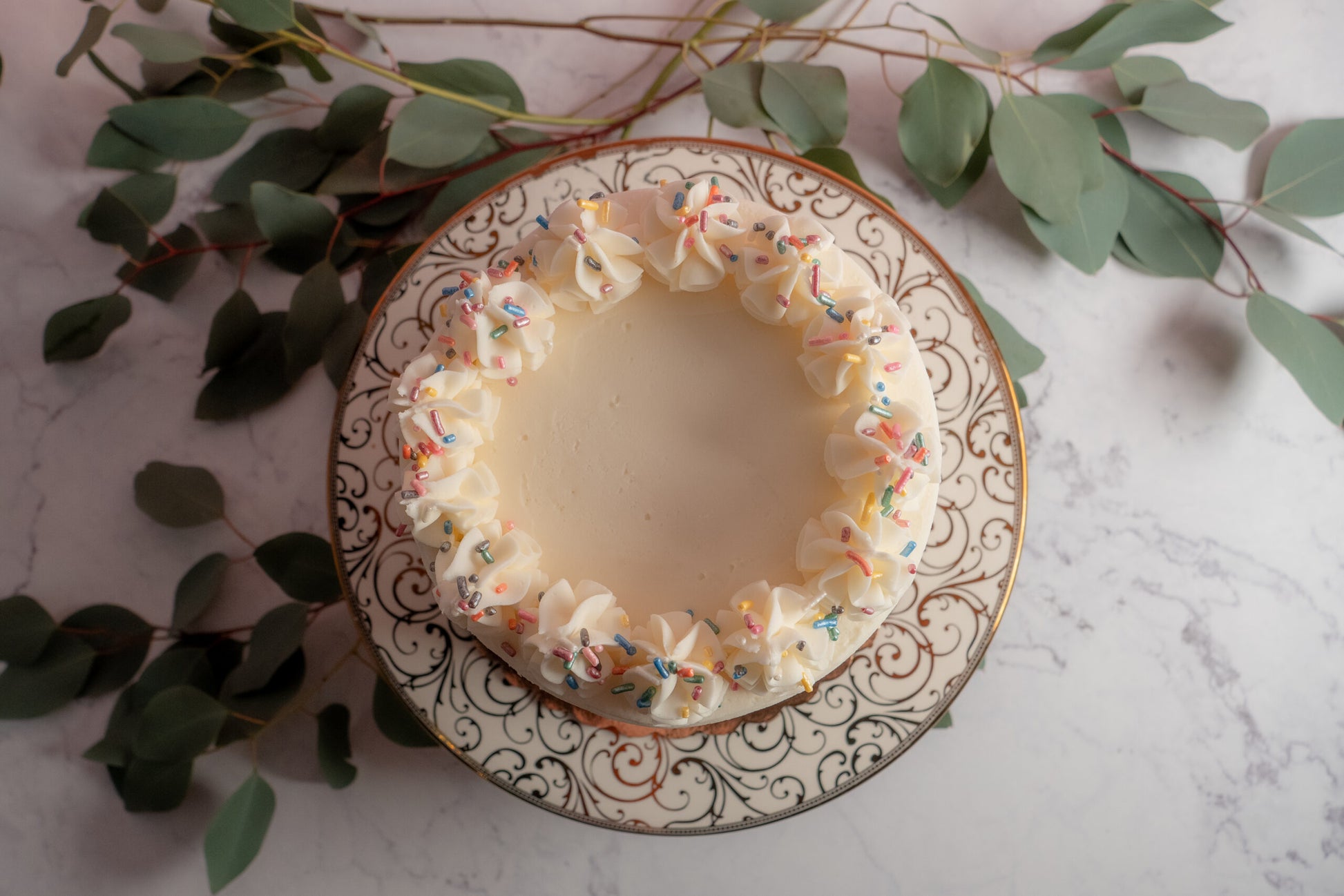 Vanilla cake; filled with vanilla buttercream; iced with vanilla buttercream; finished with white chocolate Ganache drip; topped with pearl sprinkles.