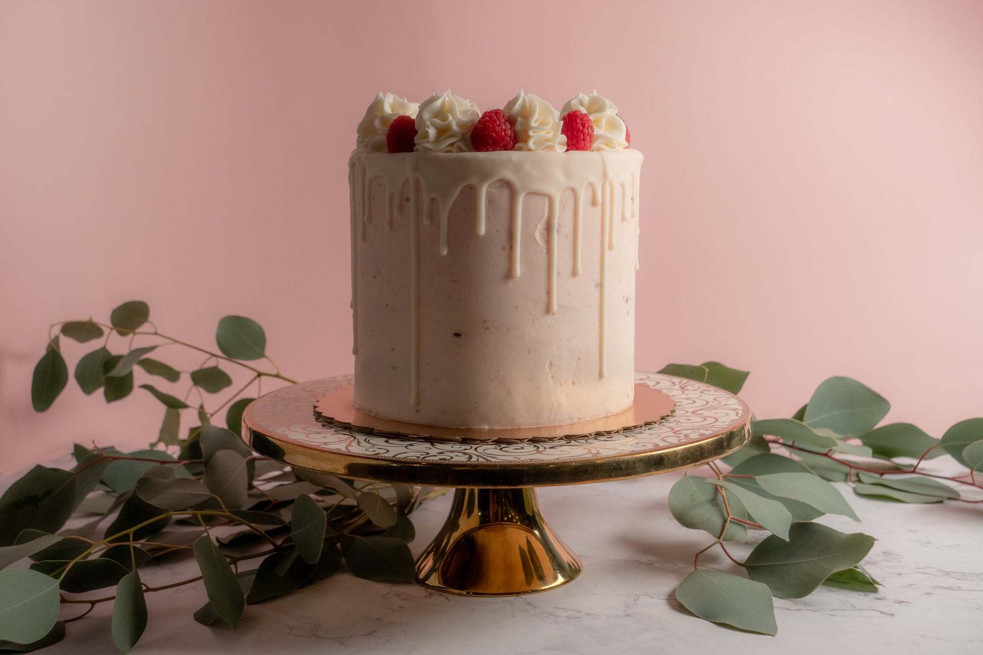 Vanilla cake; raspberry jam filling; iced in vanilla buttercream; finished with white chocolate Ganache drip; topped with fresh raspberries & dollops of vanilla buttercream.